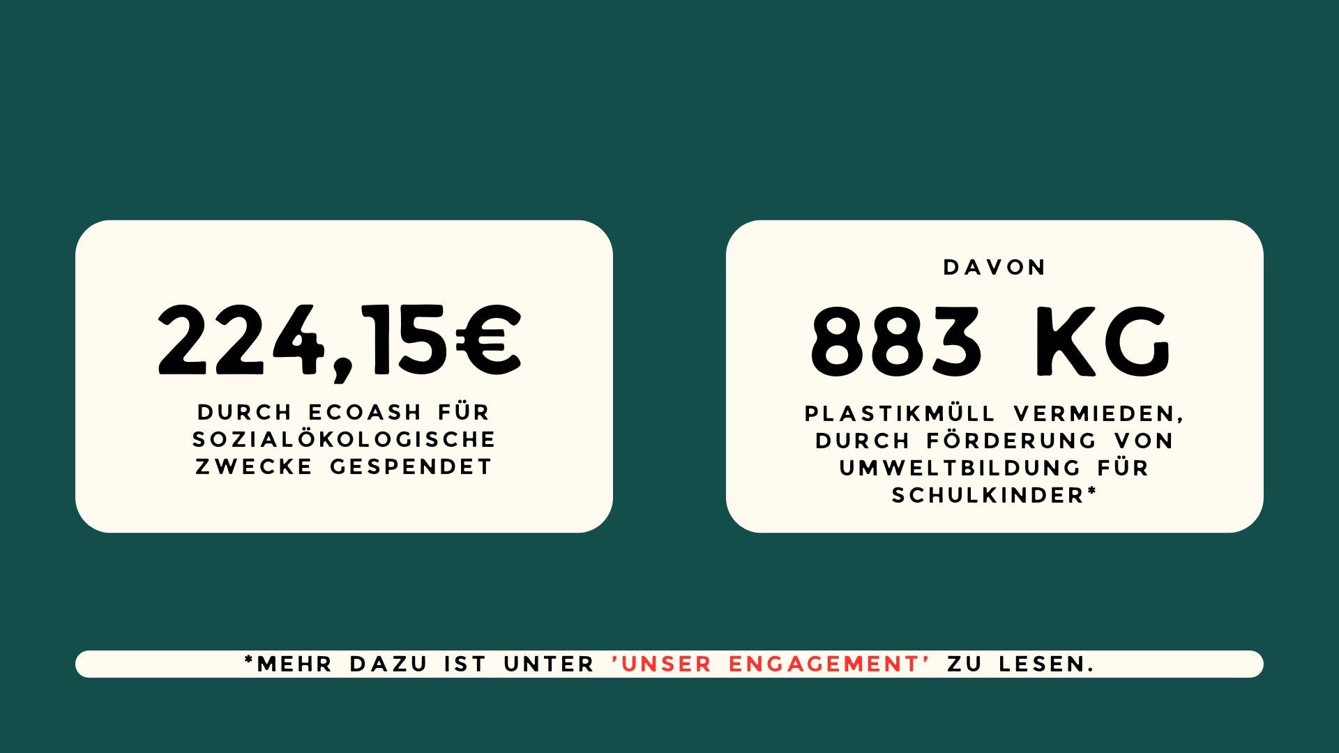 EcoAsh möchten dazu beitragen, Gewässer von Plastik zu befreien und die Natur zu schützen. Deshalb fließt ein Teil unserer Erlöse an ausgewählte NGOs, die sich für die Reduzierung und Vermeidung von Plastikabfall einsetzen und Kinder in Umweltbildung fördern. Gerade Letzteres ist die nachhaltigste Grundlage für unsere gemeinsame Zukunft.